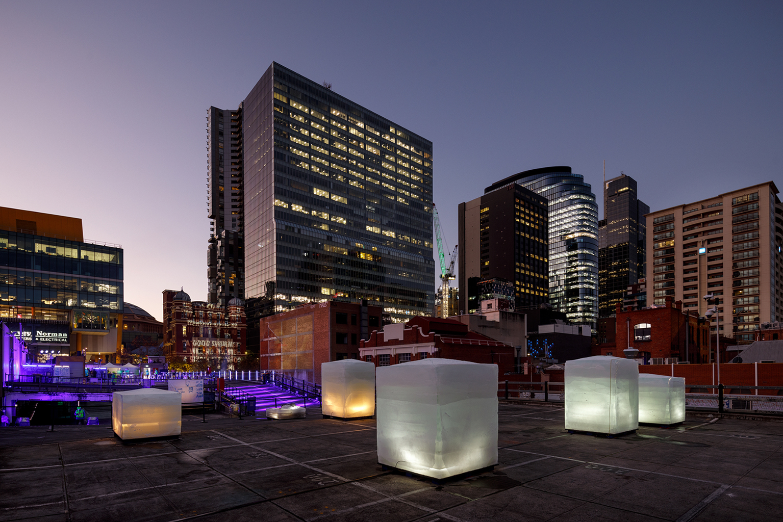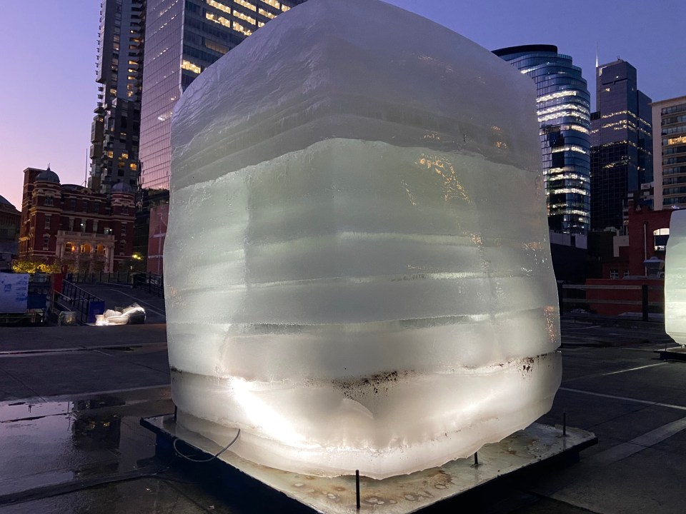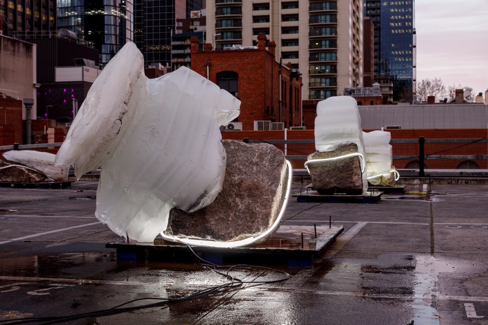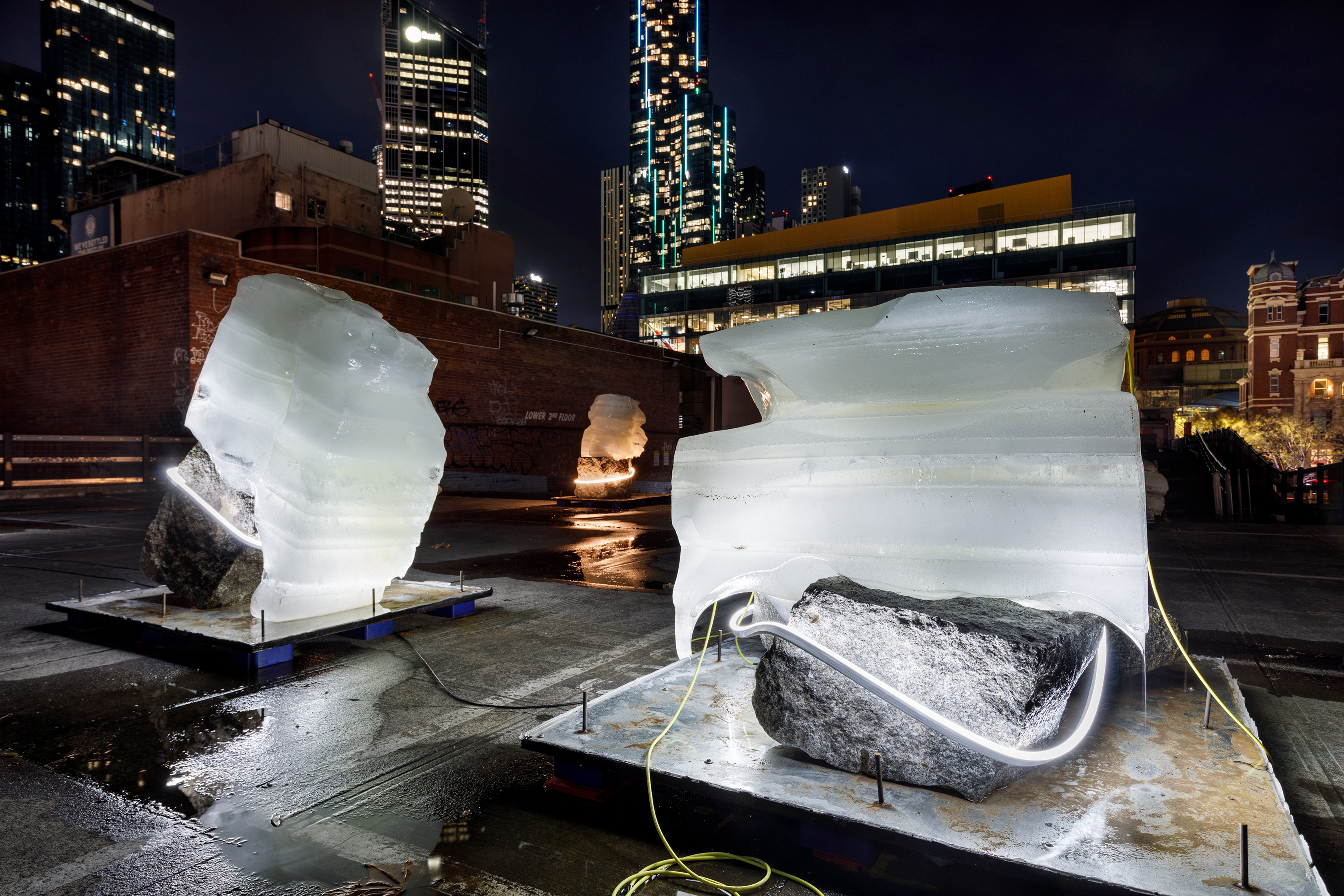 Over the RISING festival, large blocks of ice were ‘parked’ on the top floor of the Golden Square Car Park in the centre of Melbourne’s central business district. The ice blocks were composed of frozen layers of water, sourced from both the Melbourne water supply via the tap, and inland lakes in Victoria. Comprising varying degrees of translucency, mineral content and suspended sediment, as the layers melted, a mingling of lacustrine and civic water leached over the carpark and out into the city.