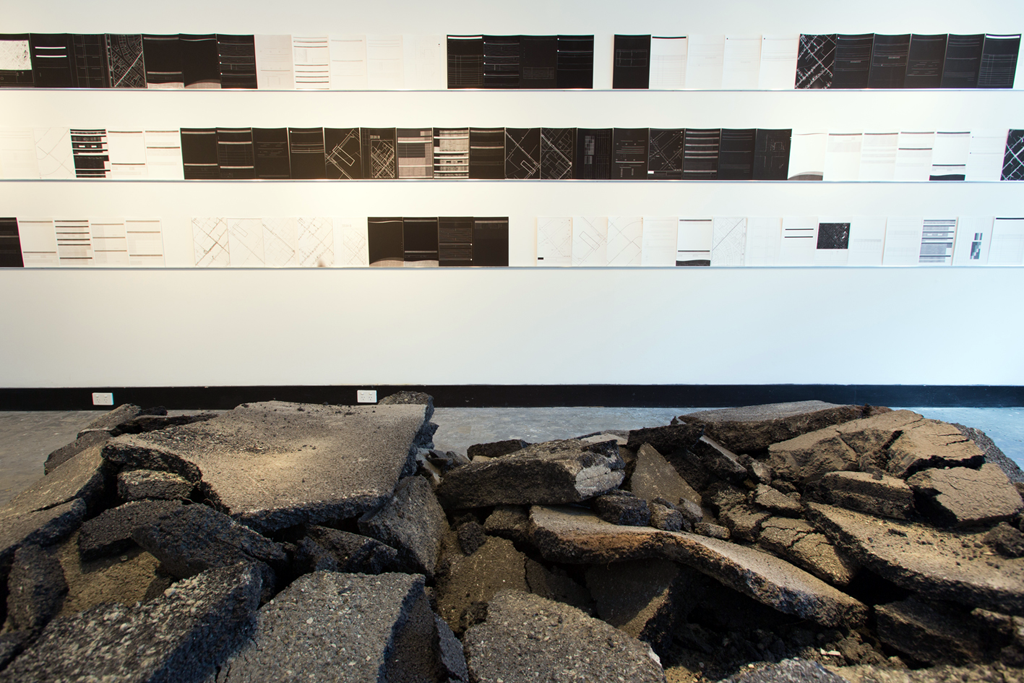The bitumen and subterranean material that previously filled the Artbike cavities has been transferred directly into the gallery space. Bleach and Vella have subsequently blended this sediment with additional material sourced from other local holes, currently under excavation.