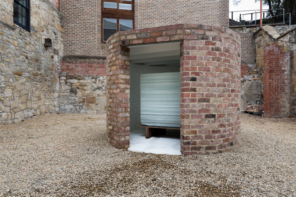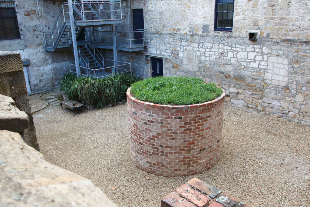 A bespoke freestanding circular room constructed from used clinker bricks reflecting the dimensions of a 19th century domestic brick ice house was sited in the centre of the outdoor exhibition space of Kelly’s garden, Salamanca Arts Centre. The brick structure contained a white painted interior and a rooftop plot sown with a green manure crop.