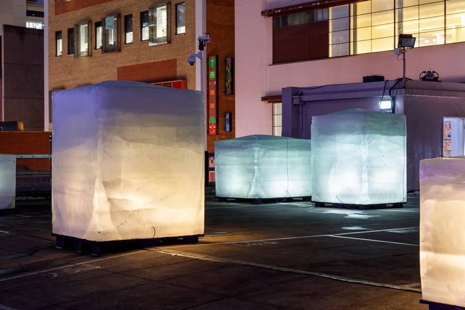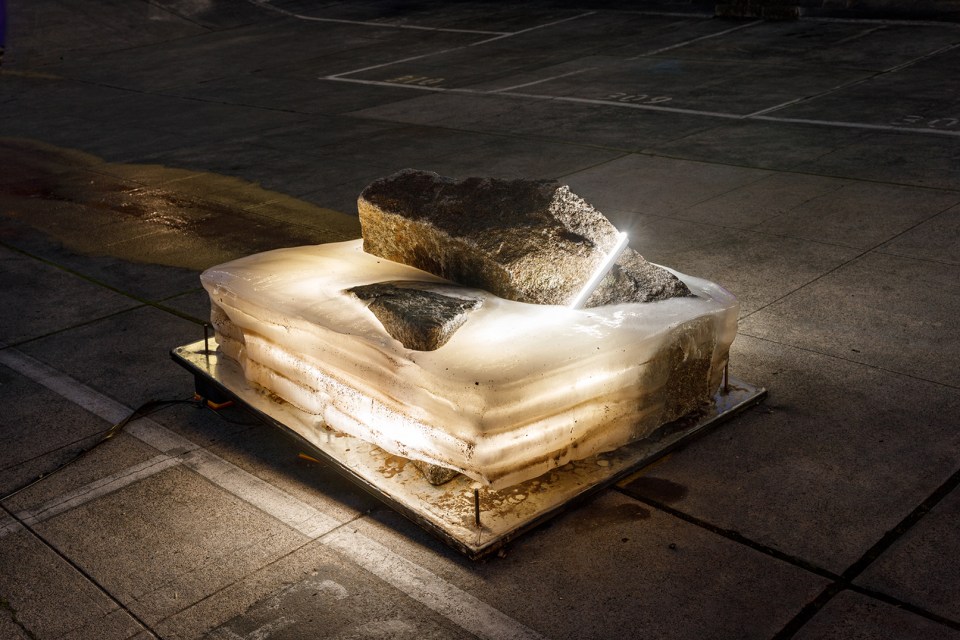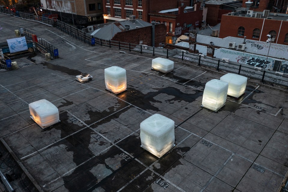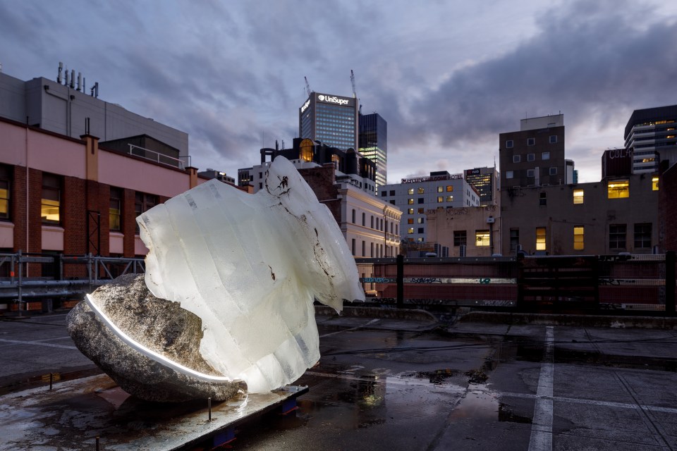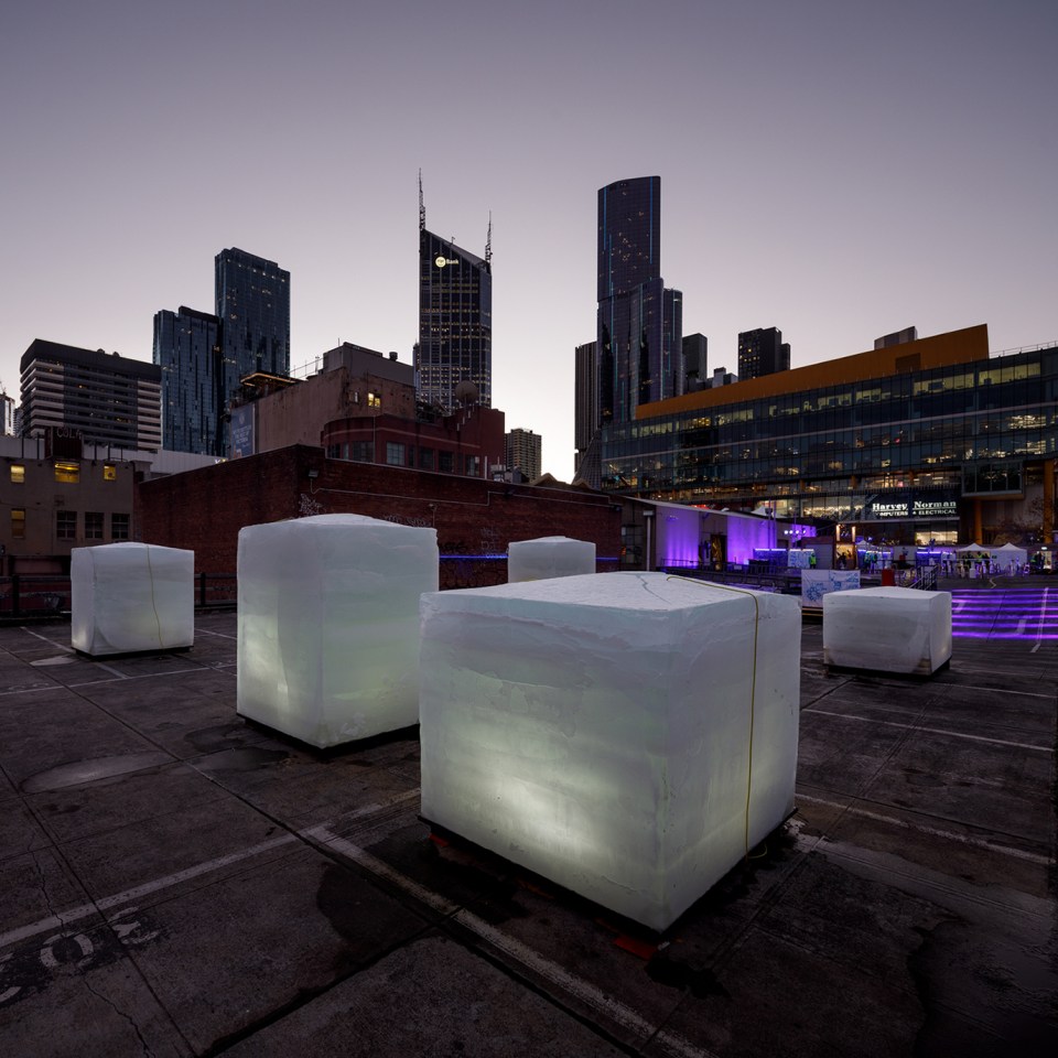 Project Description: Large blocks of cast ice were ‘parked’ on the top floor of the Golden Square Car Park in the centre of Melbourne’s central business district. The ice blocks were composed of frozen layers of water, sourced from both the Melbourne water supply via the tap, and inland lakes in Victoria. Frozen into the ice blocks, hydrophones captured the slowly cracking ice. The live sound was amplified through speakers installed in a nearby stairwell. Embedded within each ice block were boulders of Harcourt granite used for the construction of the city of Melbourne. Around each boulder neon lights pulsed an algorithm based on the approximate time of the granite’s formation, 358,900 000 million years ago, with the duration of each pulse reflecting the average length of a human breath.