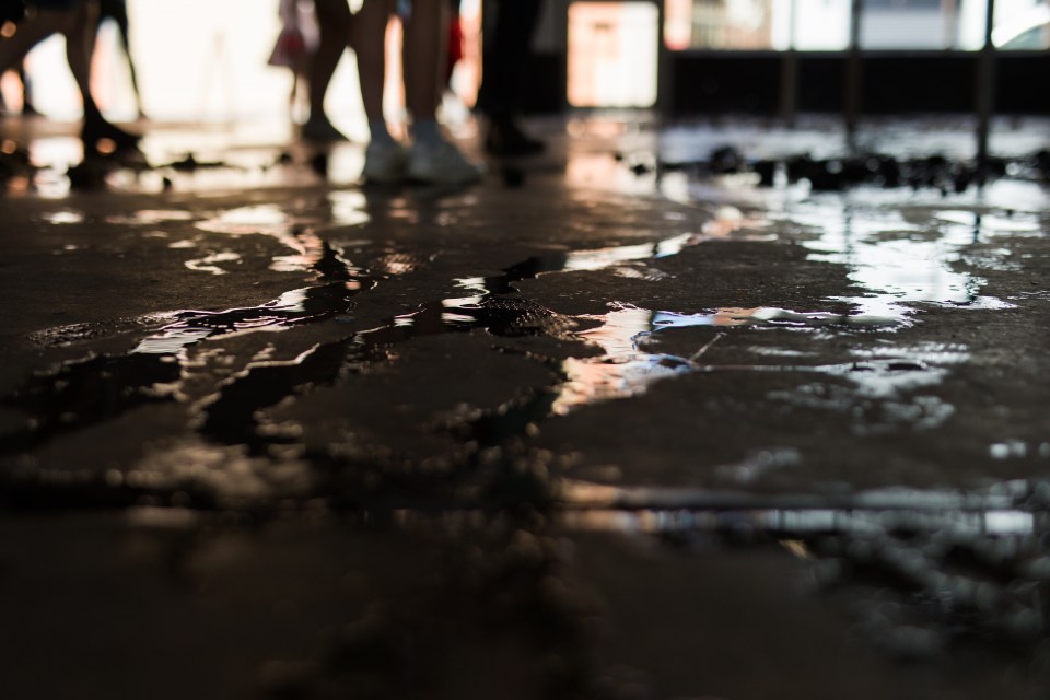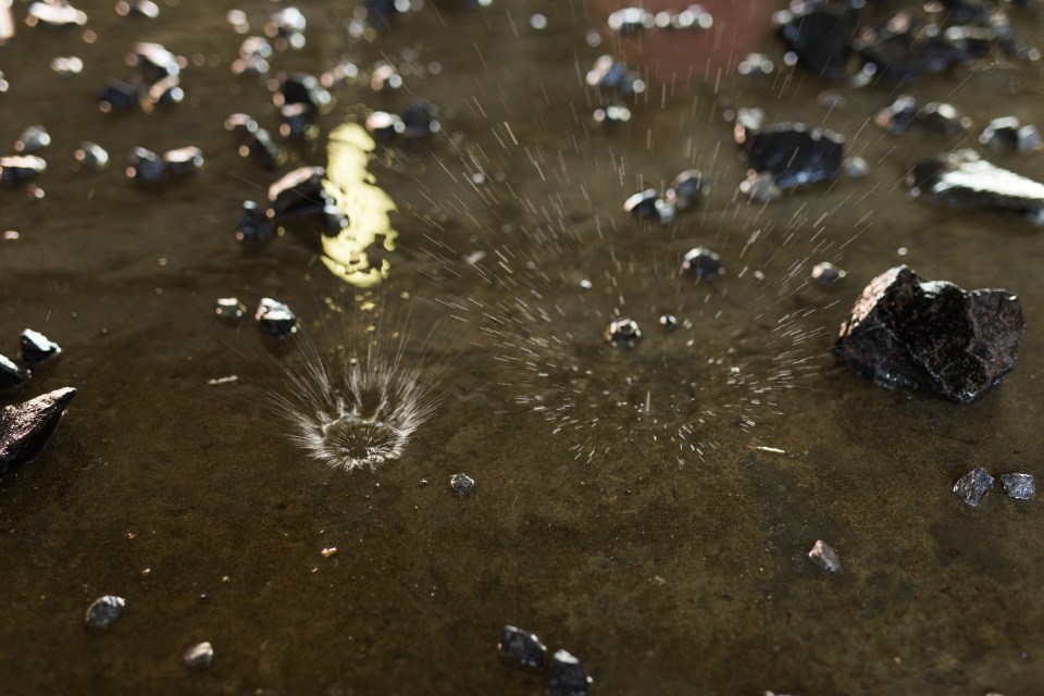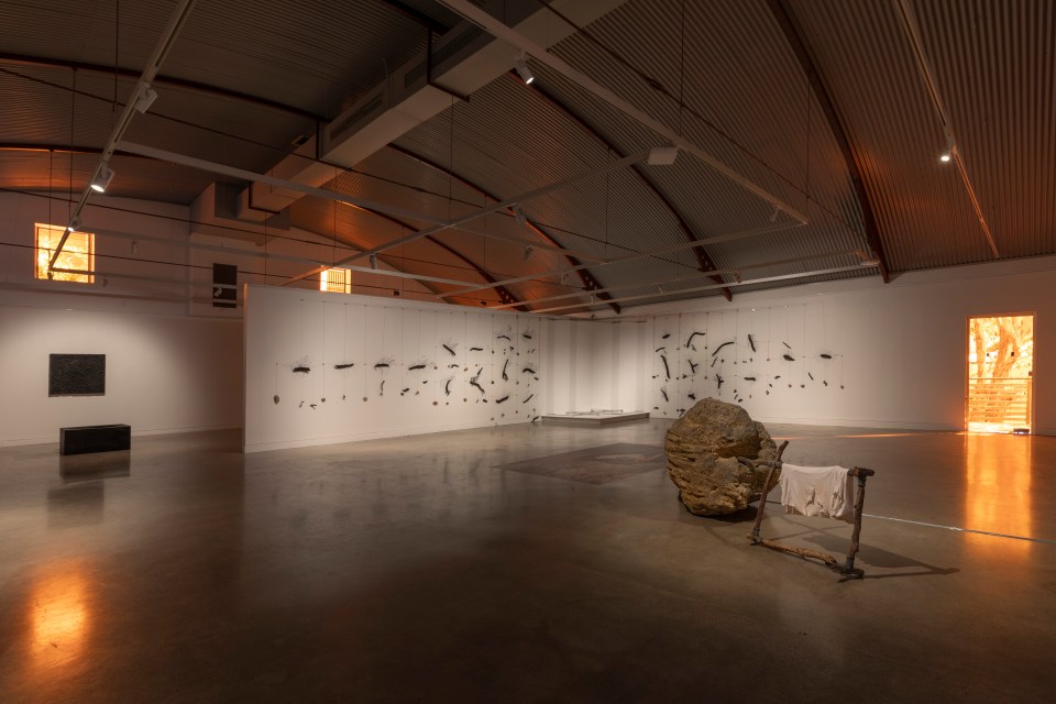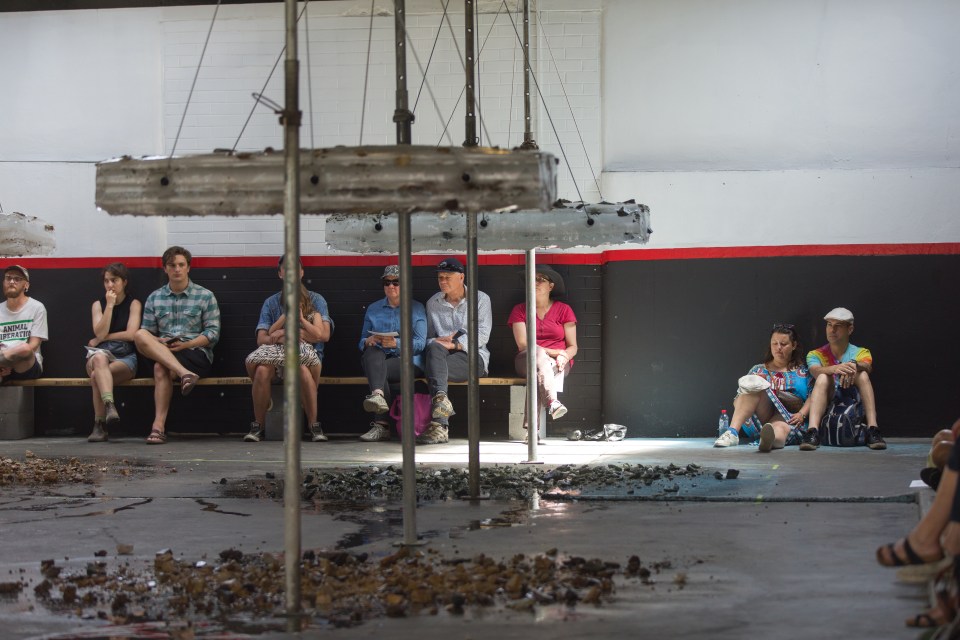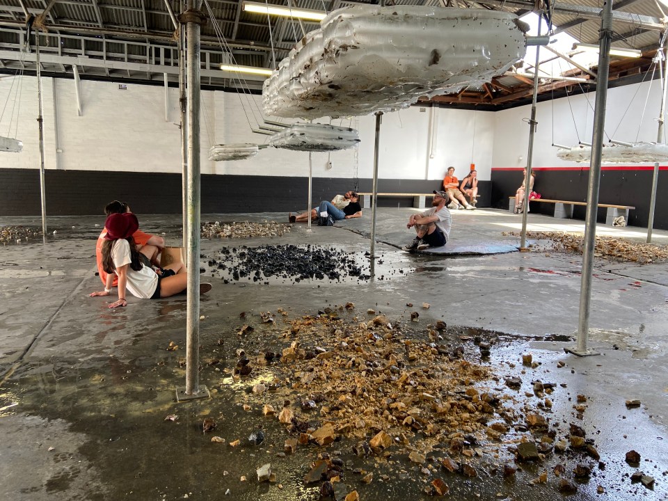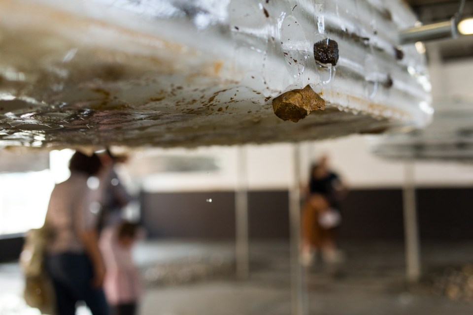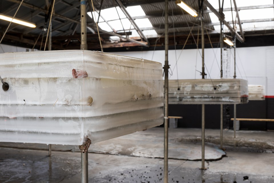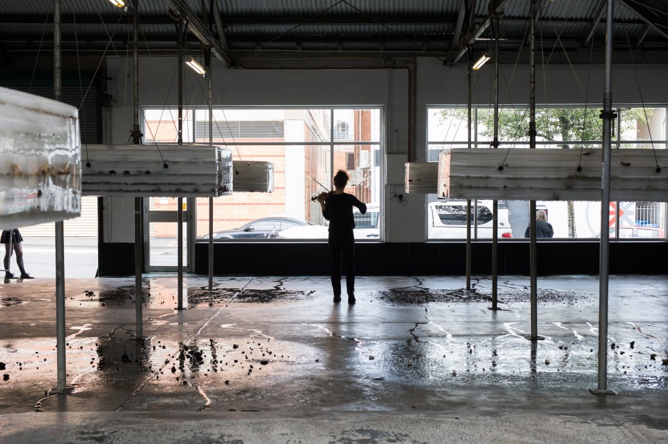 Project description: Suspended within a former car mechanic workshop, large blocks of ice contained frozen layers of rocks, each representing the different geologic periods of lutruwita / Tasmania. As the ice melted, the rocks fell to the concrete workshop floor.