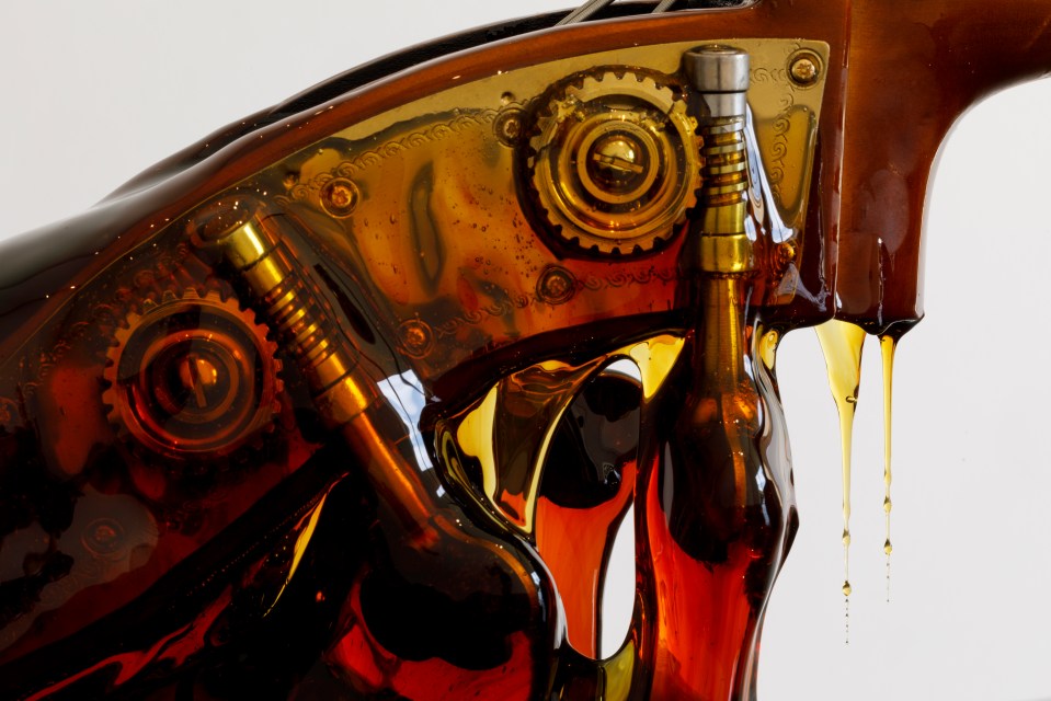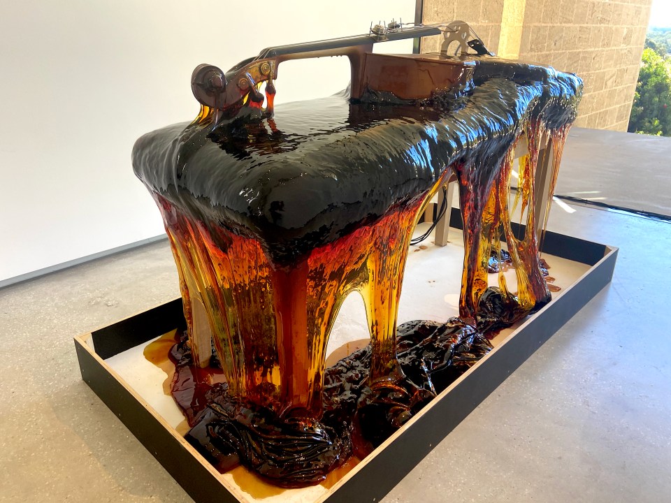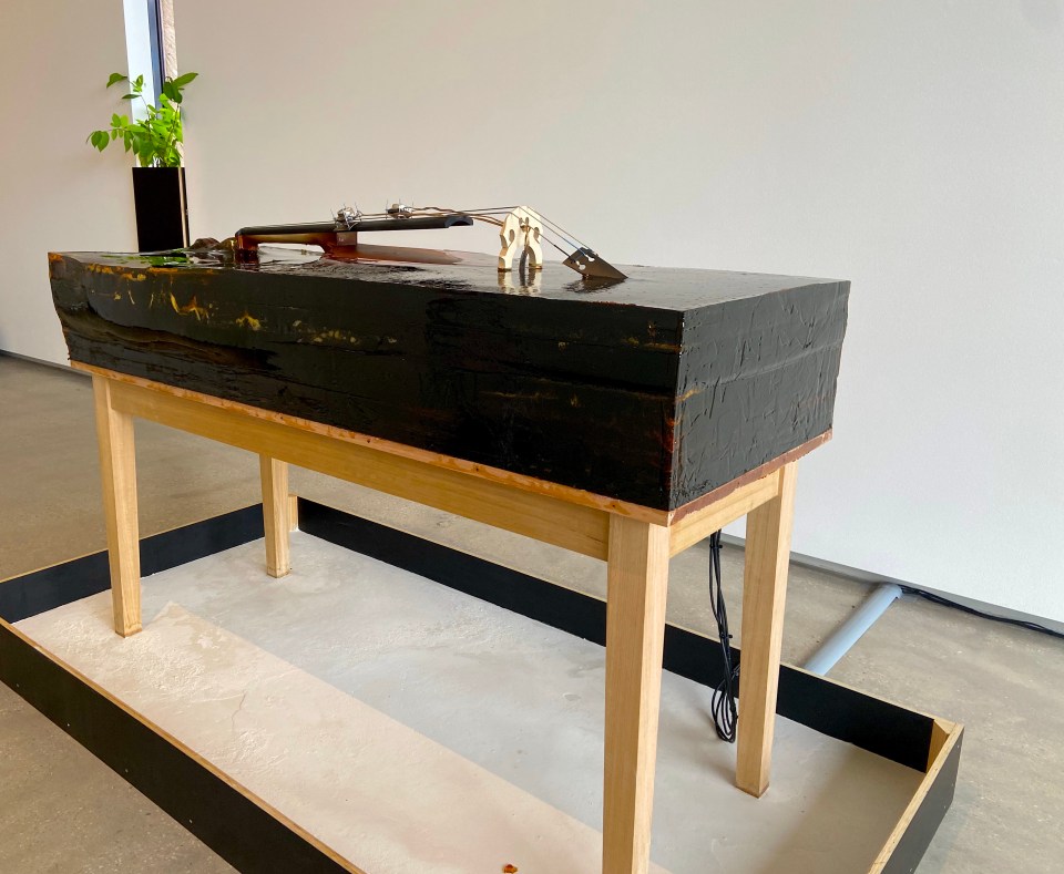 Project Description: attenuated ground (the slow seismogenic zone) responds to the geologic phenomena of slow earthquakes, which produce a delayed, imperceptible rupture over extended periods. A double bass, the largest and lowest-pitched string instrument in the symphony orchestra, is embalmed in toffee. Tactile transducers excite its exposed strings, transferring the infrasonic pulse of slow earthquake events recorded within the Japan Trench prior to the 2011 Tōhoku earthquake, which resonate at a similar frequency as that of the human body’s vascular system. As the toffee liquefies over the course of the exhibition, the tone of the double bass’ sound shifts subtly, picked up by a seismometer embedded in the toffee and amplified by vibration speakers adhered to a nearby window. Leaching gradually into a plaster base, the toffee makes visible and audible subterranean processes which are otherwise imperceptible. Slow earthquake data recorded within the Japan Trench was provided by Prof. Yoshihiro Ito from the Disaster Prevention Research Institute, Kyoto University, Japan