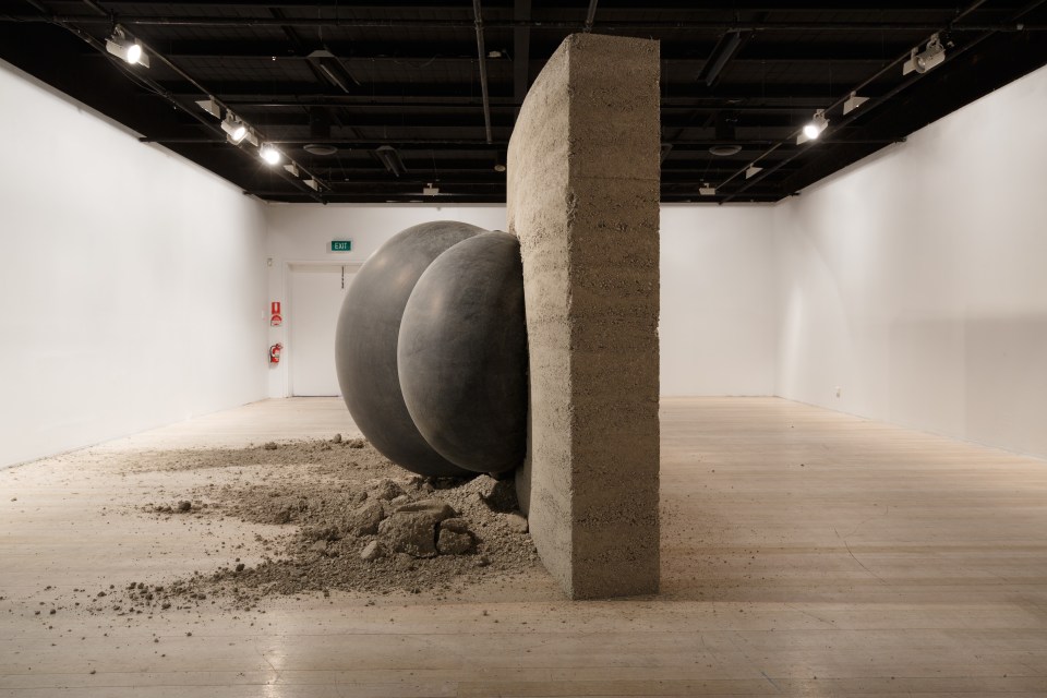 Project description: A simple arc wall comprised of rammed, re-cycled crushed concrete contained two earthmover tyre inner tubes connected via hoses to an air compressor. Global seismic data from live web-based monitoring streams, as well as local ‘vibrations’ collected within the gallery administration and gallery space, triggered the air compressor to release air and inflate the inner tubes. Contingent on the intensity and duration of the local or global live seismic events, the inner tubes inflated and destabilised the overall form, triggering a process of destruction over the course of the exhibition.
