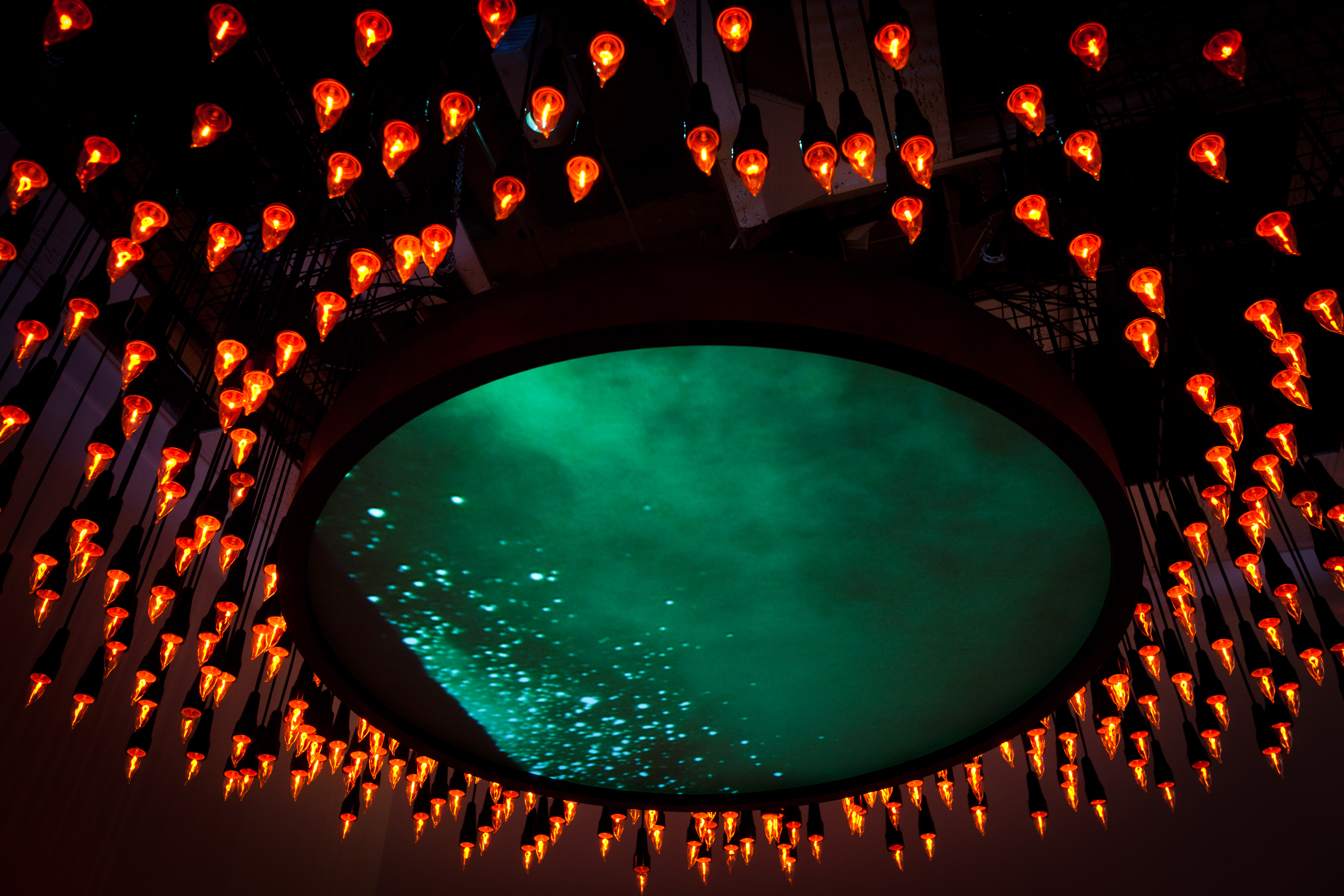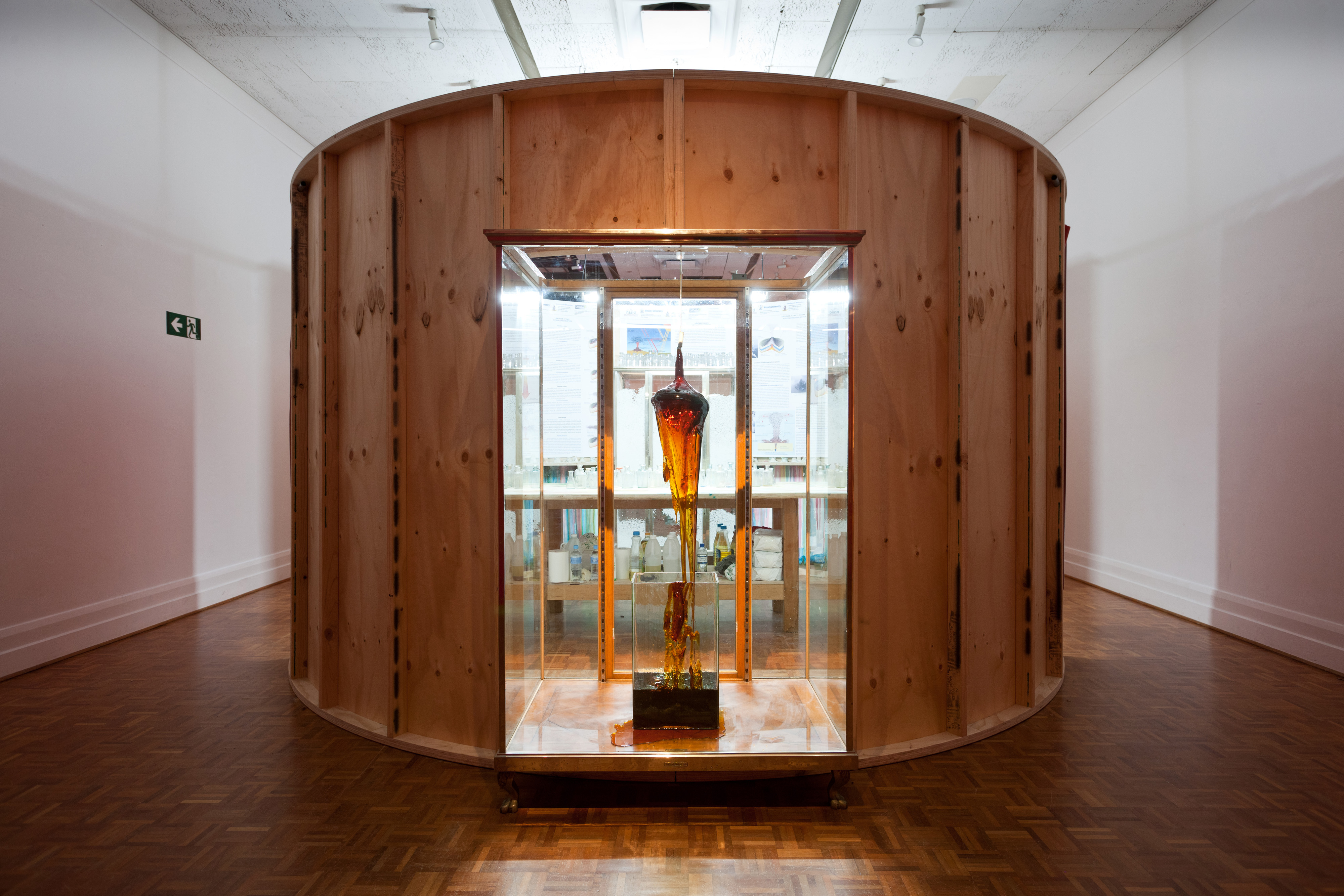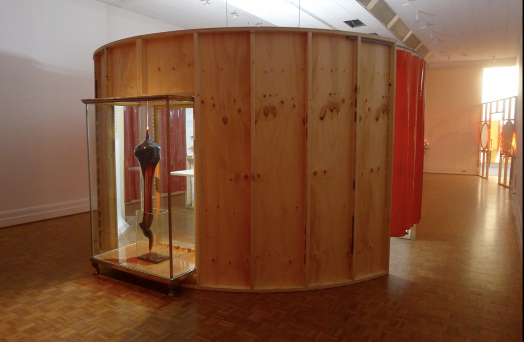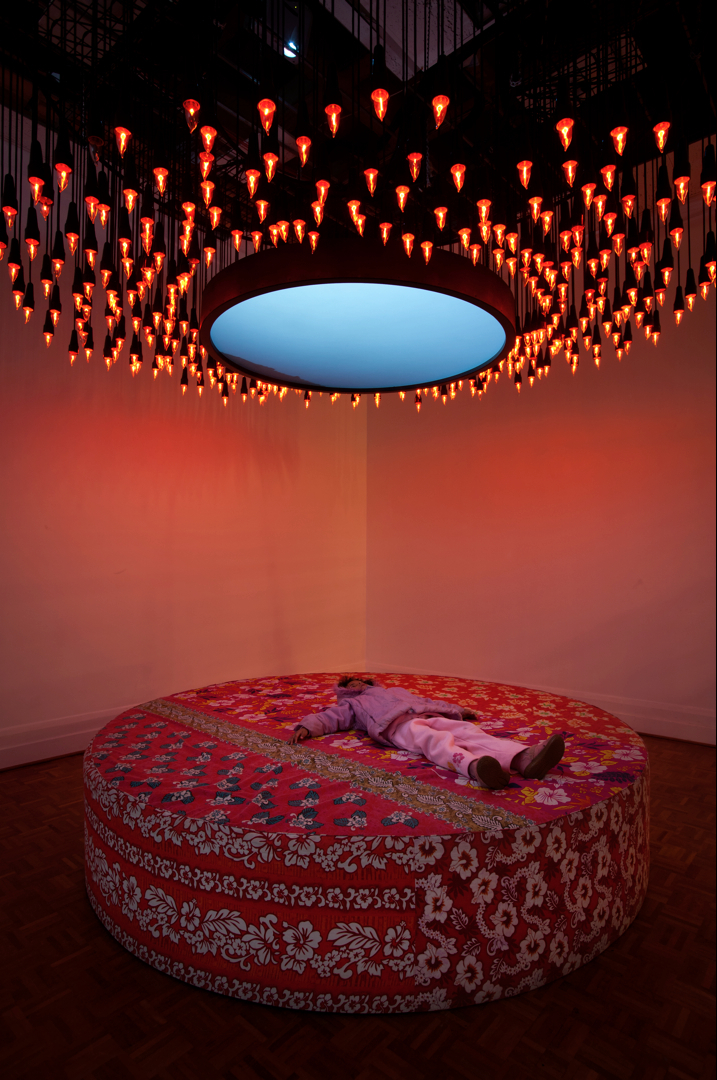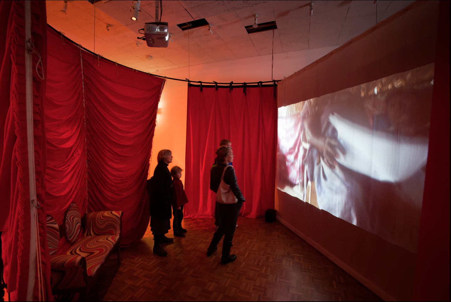 materials: 2 x single channel video projections, flicker-flame light bulbs, upholstered circular bed, cast plaster, chromographic paper, toffee, museum vitrines, plywood, pine-stud frame, fire-retardant welding curtains, velvet drapery, upholstered ‘love-seat’, reverse microphone-speaker